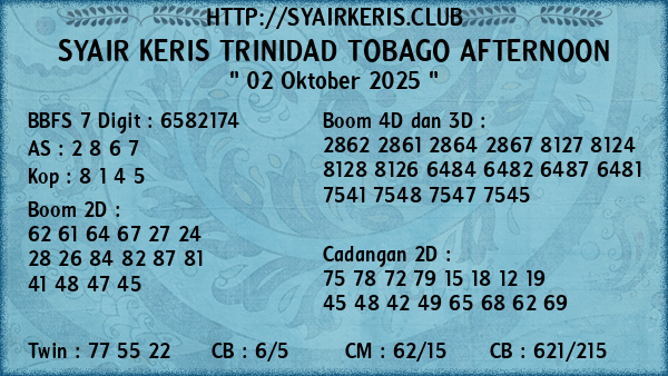 Prediksi Syair Keris Jitu Trinidad Tobago Afternoon Kamis, 02 Oktober 2025