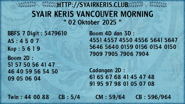 Prediksi Syair Keris Jitu Vancouver Morning Kamis, 02 Oktober 2025