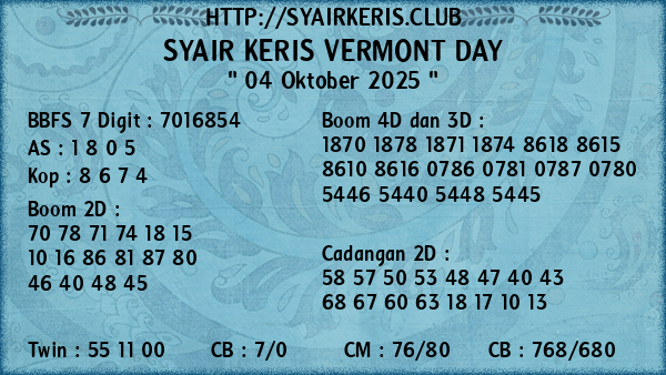 Prediksi Syair Keris Jitu Vermont Day Sabtu, 04 Oktober 2025