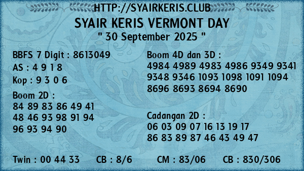 Prediksi Syair Keris Jitu Vermont Day Selasa, 30 September 2025