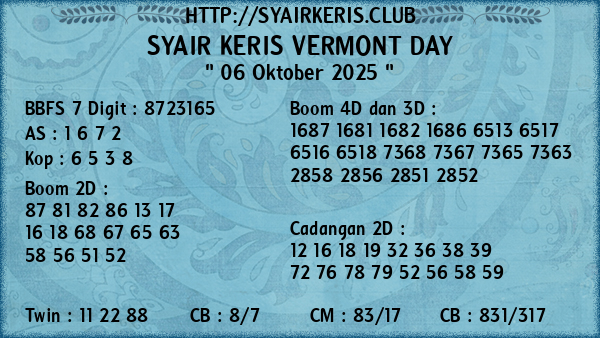 Prediksi Syair Keris Jitu Vermont Day Senin, 06 Oktober 2025