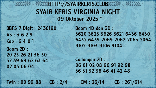 Prediksi Syair Keris Jitu Virginia Night Kamis, 09 Oktober 2025